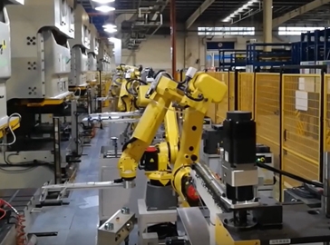 利用現有沖壓設備,添加16臺機械手替代人工,實現通用線15臺沖壓設備自動化流水作業。具備整線連線自動,部分連線自動,單工位自動等切換功能。